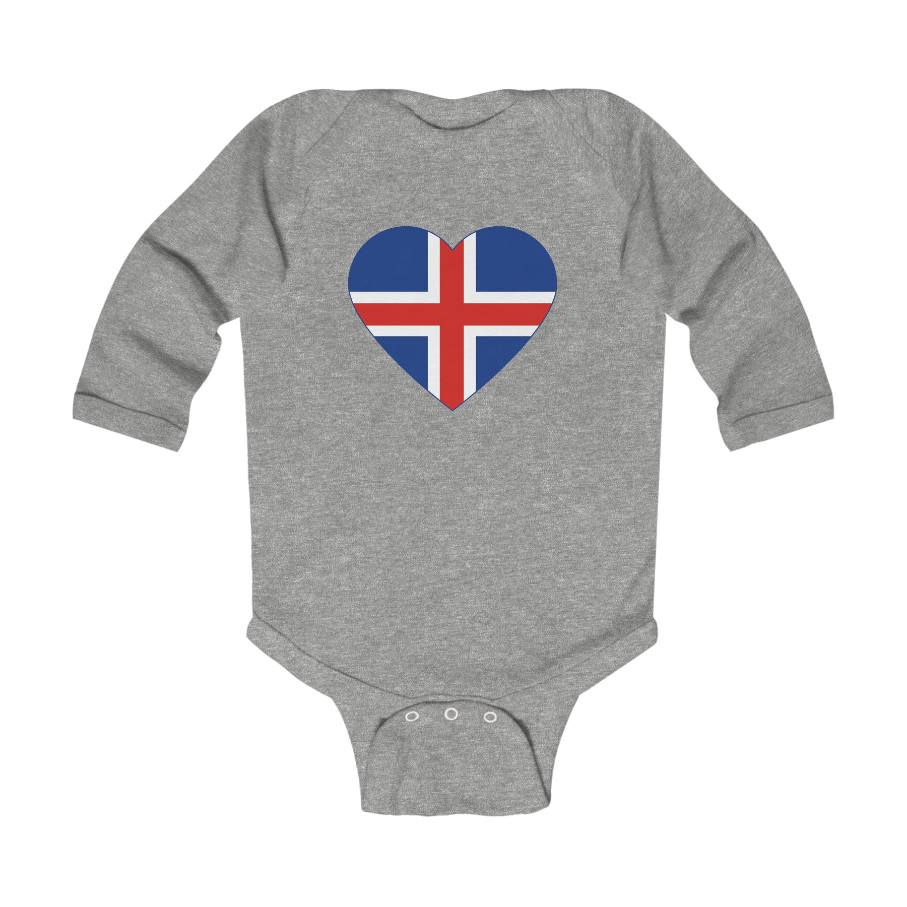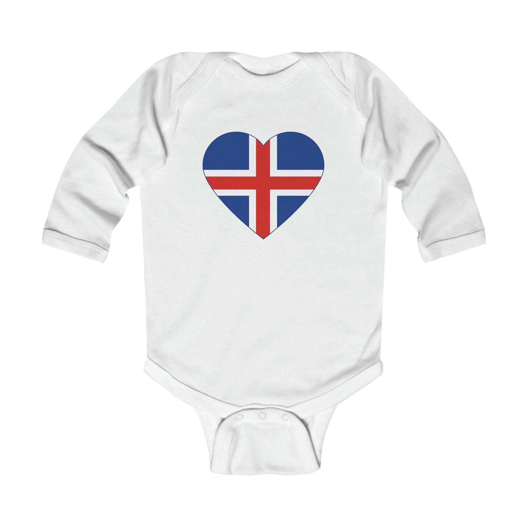 Our super soft Icelandic flag heart long sleeve bodysuits feature lap shoulders to make dressing easier. 5 ounce, 100% combed cotton. Flatlock side seams with ribbed binding at neck, shoulders, sleeves, and leg openings. Reinforced three-snap closure.