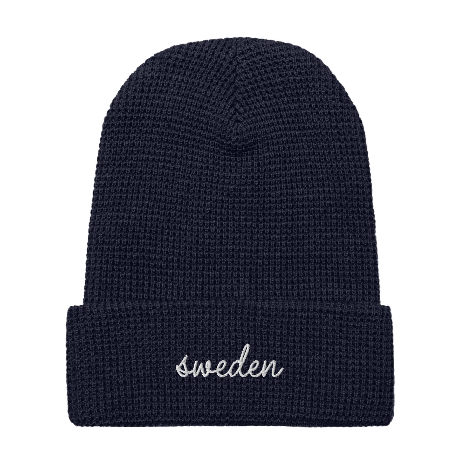 Our super soft Sweden script waffle knit beanie will help you stay warm on all your outdoor adventures. Thanks to an adjustable cuff and flexible material, it’ll fit snugly on your head while hiking, camping, or more!