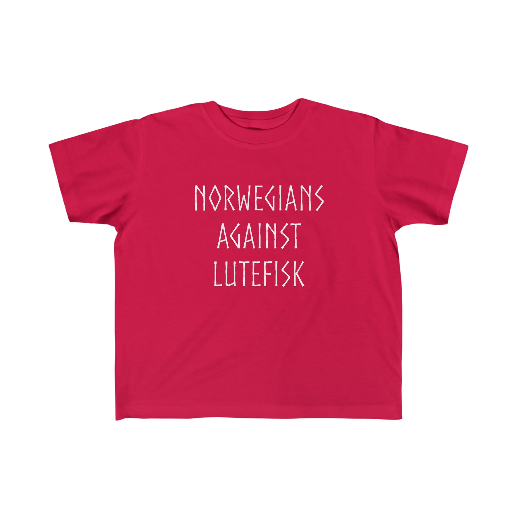 This Norwegians Against Lutefisk toddler t-shirt holds up to the toughest of play, yet still feels soft against toddler skin.