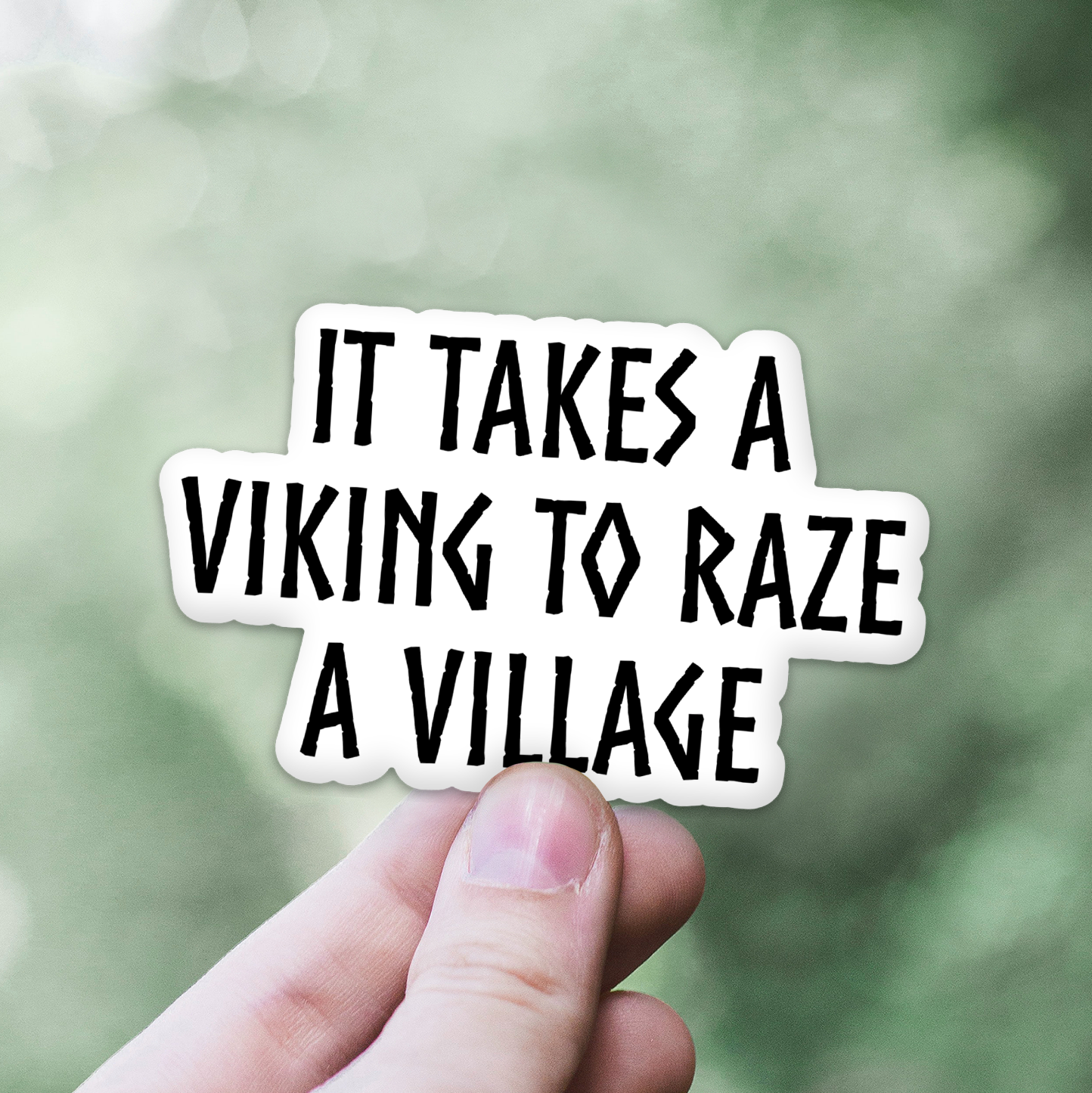 It Takes A Viking To Raze A Village sticker for indoor or outdoor use, can be removed from most surfaces without causing damage. Measures 4"x4".