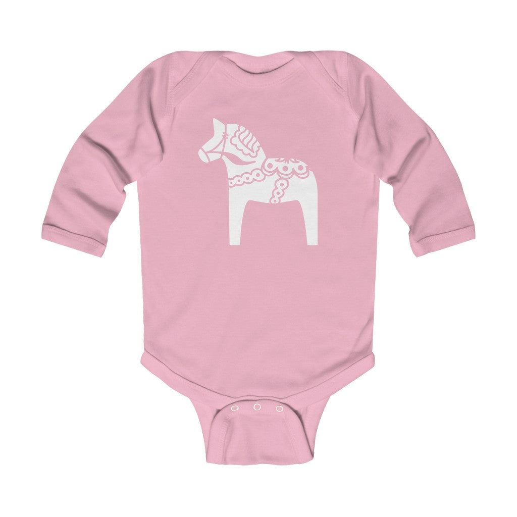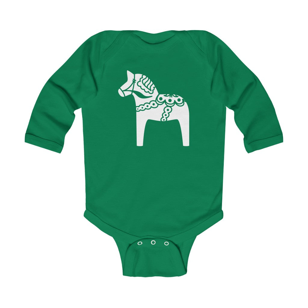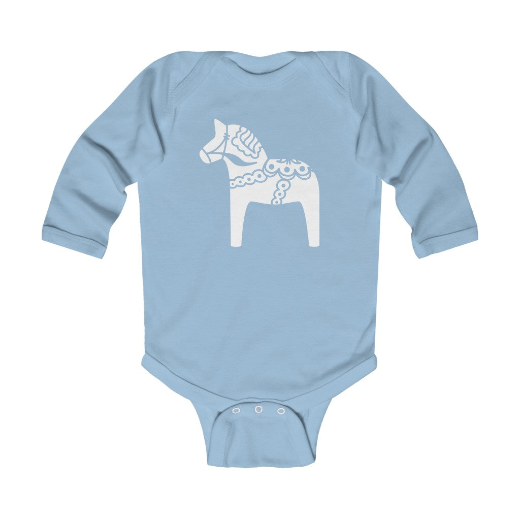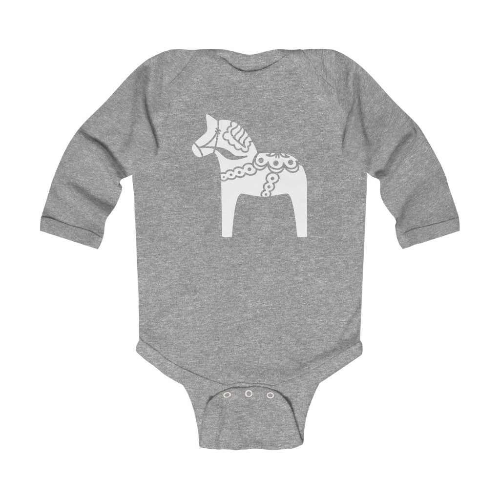 Our super soft Swedish Horse long sleeve bodysuits feature lap shoulders to make dressing easier. 5 ounce, 100% combed cotton. Flatlock side seams with ribbed binding at neck, shoulders, sleeves, and leg openings. Reinforced three-snap closure.