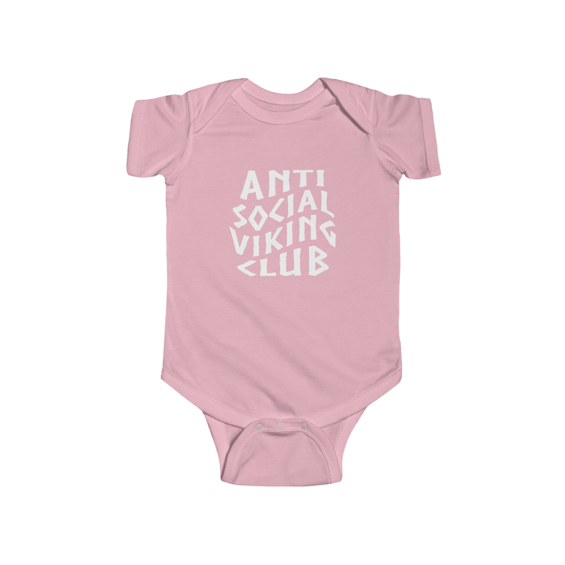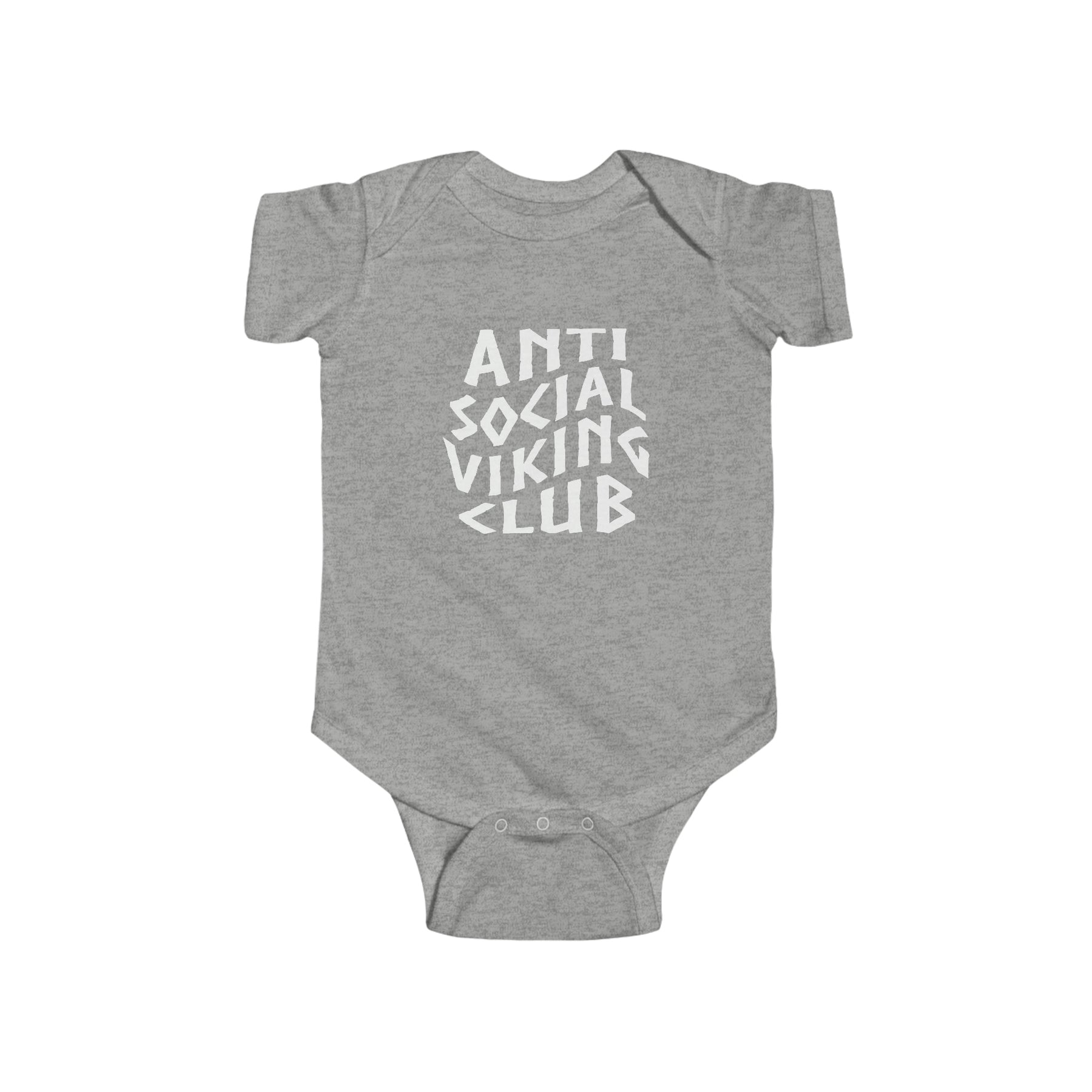 This super soft Anti Social Viking Club baby bodysuit is 100% combed cotton and designed to be comfortable next to delicate baby skin. The lap shoulders and reinforced three snap closure makes for ease of dressing.